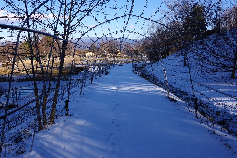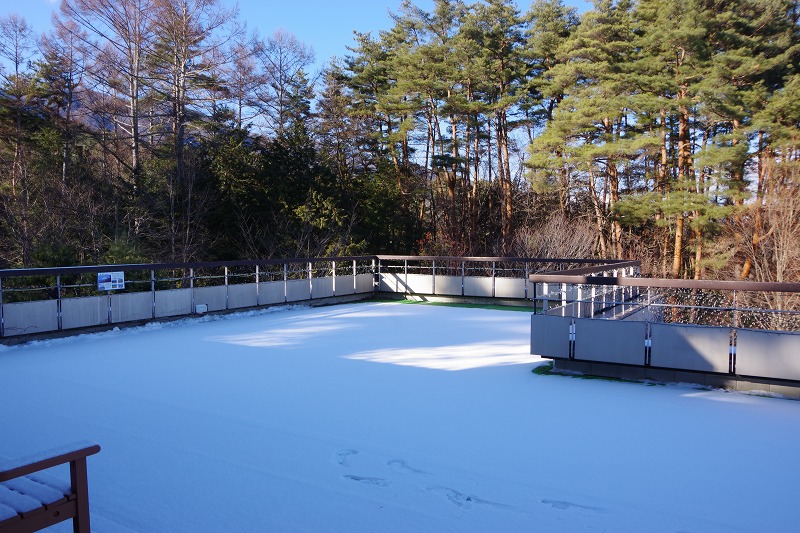 昨日は日が落ちてから雨が降り始め、夜には雪に変わりました。今日の公園は薄っすらと雪化粧です。雪が少なくても踏み固めると凍ってしまうので、雪かきをしましたよ。ガイドセンター前のスロープの後、あづみの学校前の雪かきです。