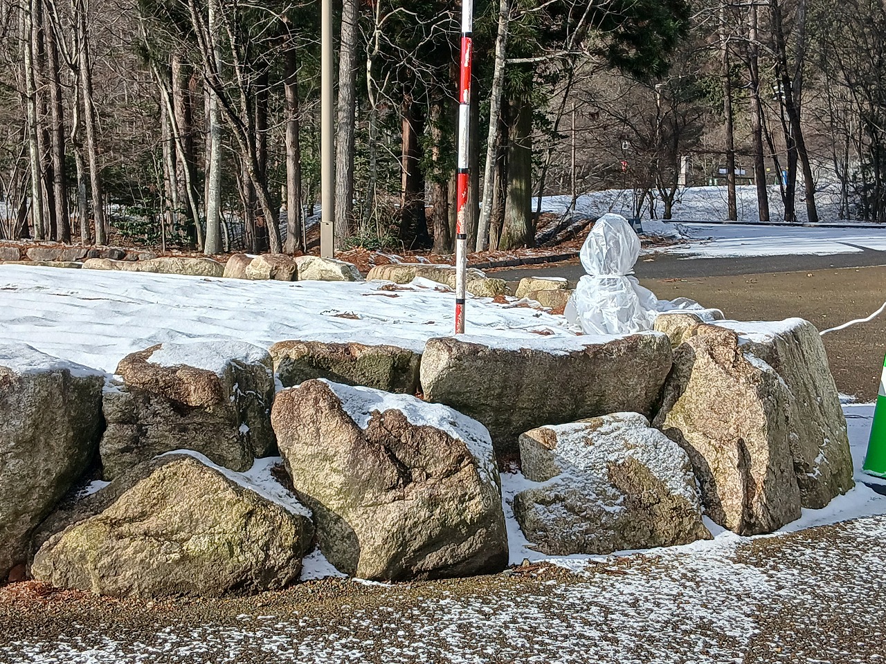昨日は日が落ちてから雨が降り始め、夜には雪に変わりました。今日の公園は薄っすらと雪化粧です。雪が少なくても踏み固めると凍ってしまうので、雪かきをしましたよ。ガイドセンター前のスロープの後、あづみの学校前の雪かきです。