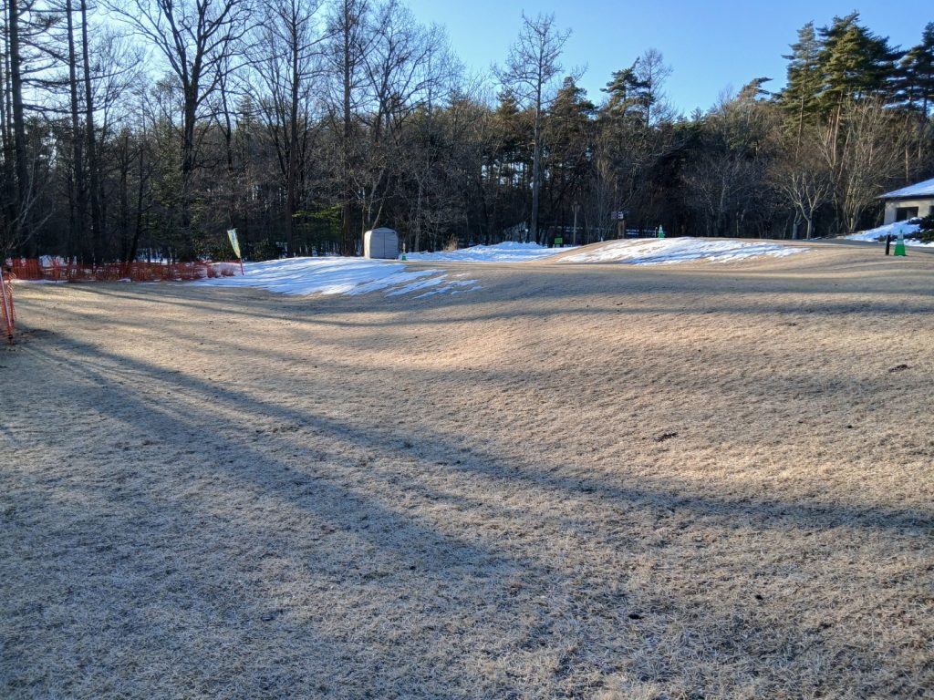 「アルプス大草原」と「入口広場」のそりゲレンデは、水が溜まってしまっています。