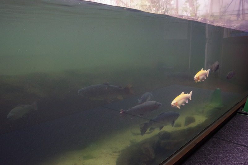 休園日の今日は、あづみの学校玄関ホールに面した屋外水槽の掃除の日です。夏に比べて汚れが少ないので、お魚が見えるくらいの濁りで済みました。