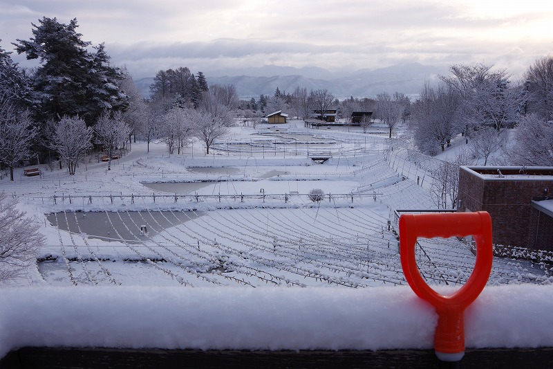 昨日から今朝にかけて降った雪で、公園は一面雪景色になりました。展望テラス2階の手摺に積もった雪は7~8㎝ほどでしょうか。地面よりも多いようです。