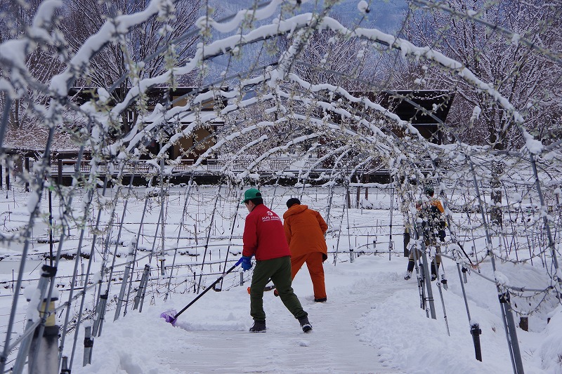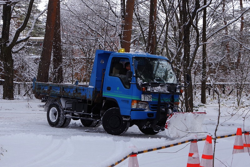 雪が降れば、お馴染みの除雪トラックやホイールローダーでの除雪作業。開園に間に合わせるように走ります。雪を掻く「ザー」という音が公園内に響きます。