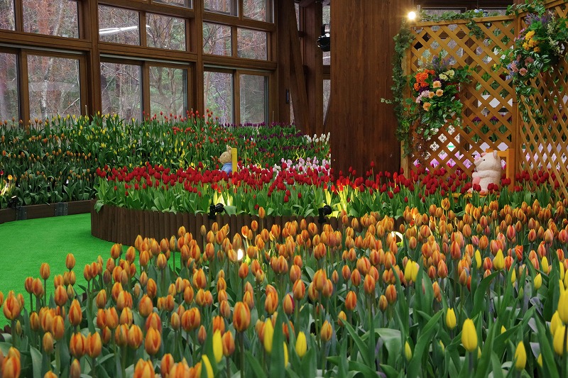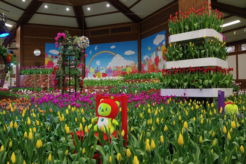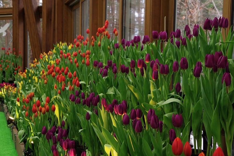 あづみの学校多目的ホールで開催中の『インドアガーデン アイスチューリップの庭』では、すべてのチューリップに色が付いて見頃になりました。