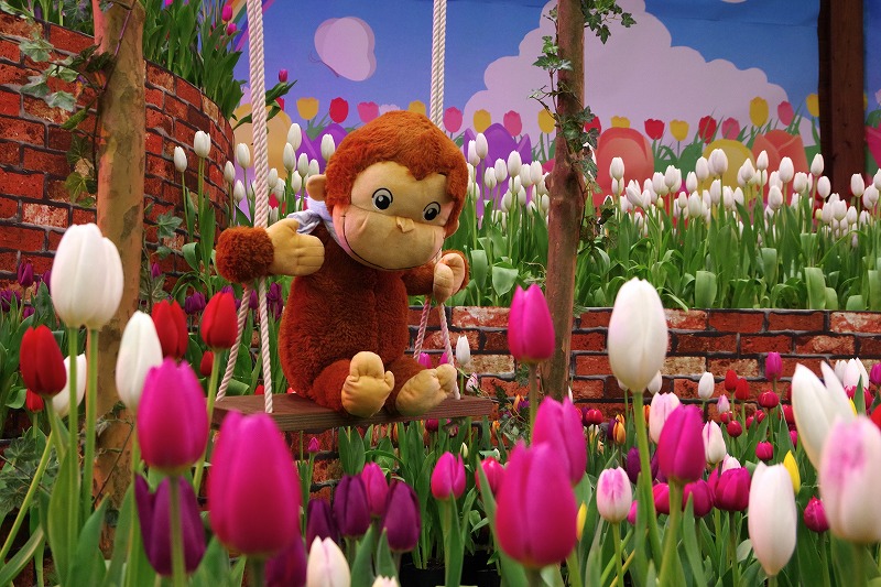 ブランコに乗った〝おさるのジョージ〟も嬉しそうです。少し下を向いていますが、きれいなチューリップをじっと見つめているようで可愛らしいですね。