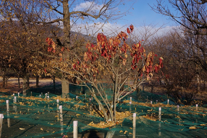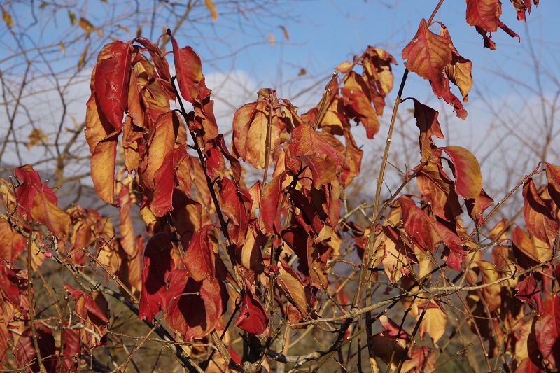 段々原っぱでは、チューリップ畑のサル除けネットに挟まれたマユミの木があります。マユミもあちこちで遅い紅葉の葉が残っているのを見かけます。