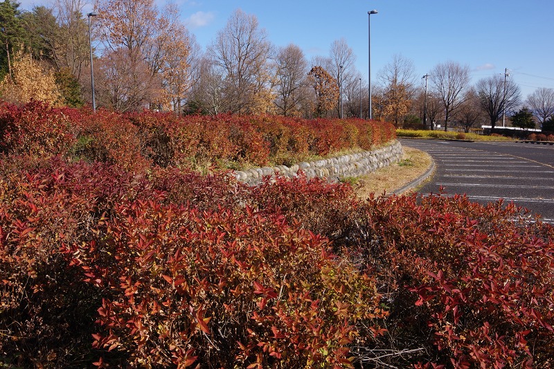 第2駐車場の植え込みに並ぶのはシモツケです。他の木々の紅葉はすでに終わっていますが、霜や雪にも負けずに遅い紅葉を見せてくれています。