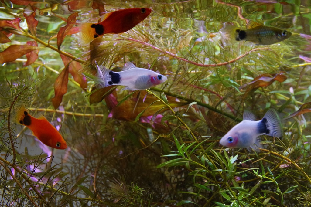 水中パレードを繰り広げるのは、イルミネーションのように鮮やかな南米原産のカラシンの仲間。上がカージナルテトラで下がグリーンネオンテトラです。