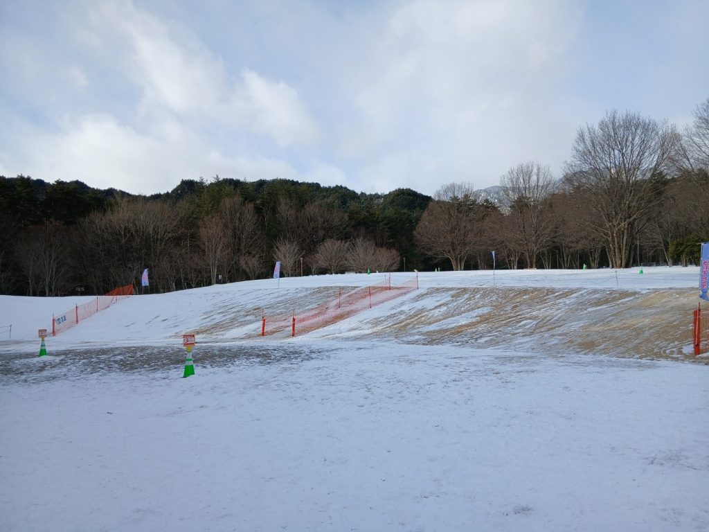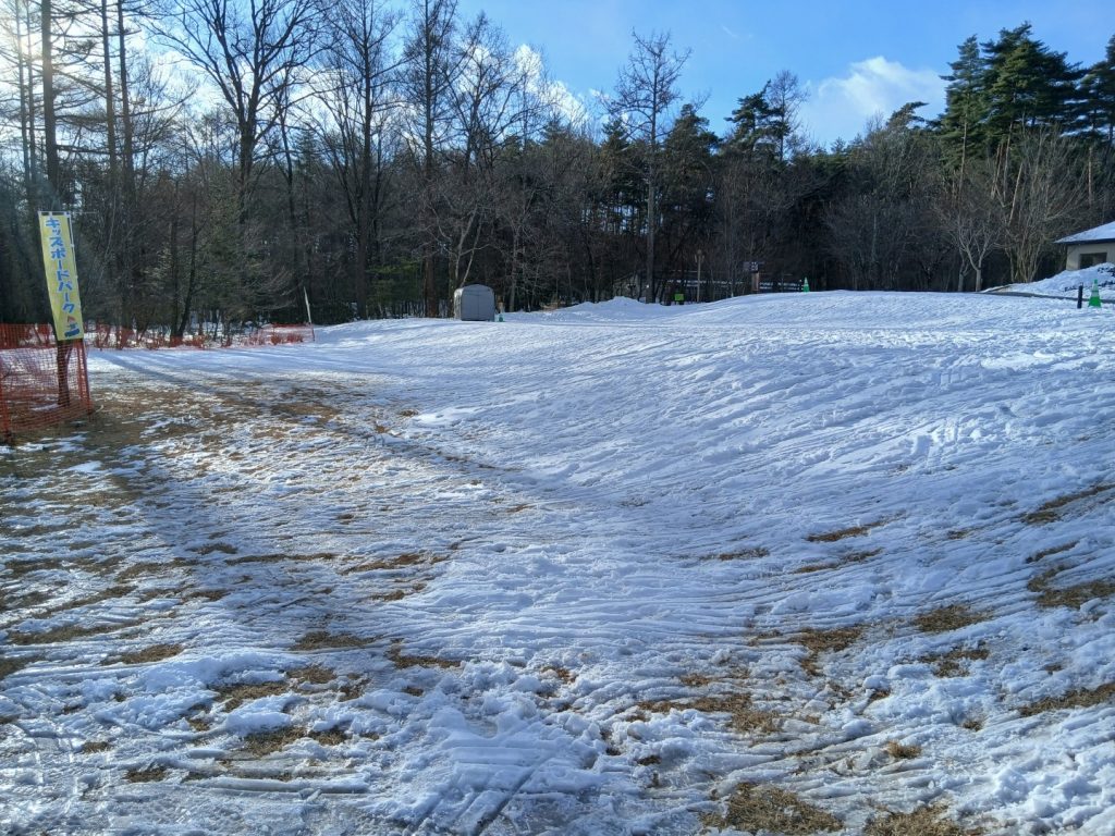 アルプス広場のそりゲレンデは、雪が残っていますがアイスバーンとなっており、ところどころ芝生が見えている状態です。