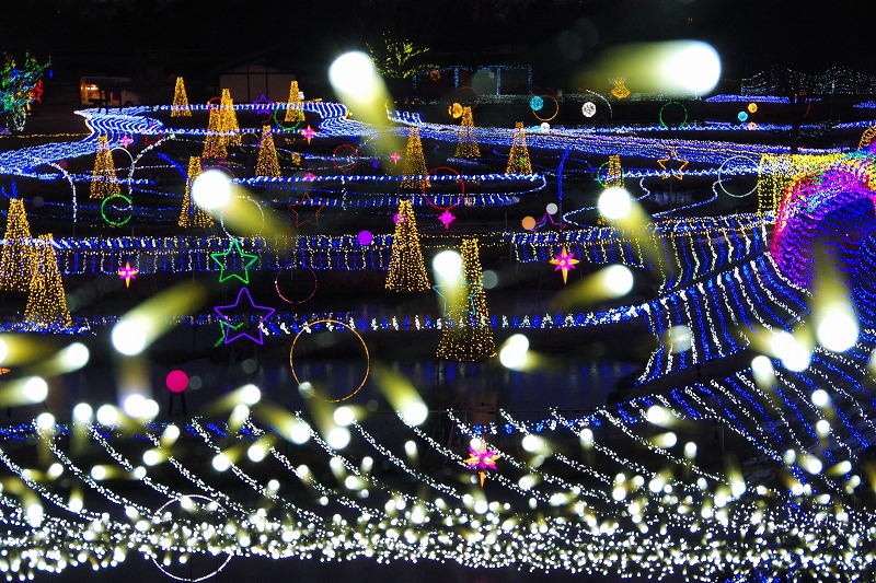 展望テラスの2階から池へと張られたイルミネーションの束は「天の川銀河」となって頭上を覆います。無数の流れ星の様にも見えますよ。