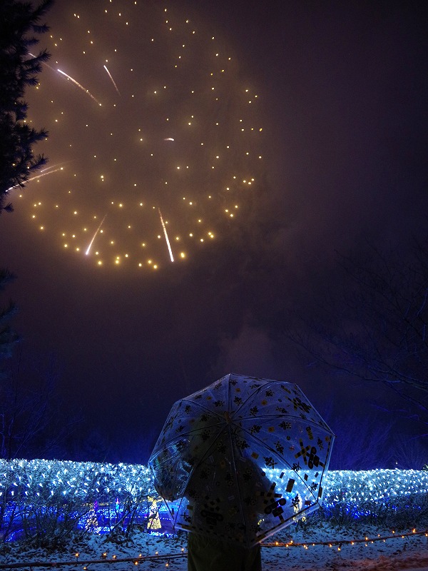 今月末で終了する『Winter Illumination 2025』。期間中の花火の打ち上げも今日が最後です。ラスト花火は夕方から降り始めた雪との競演になりましたよ。
