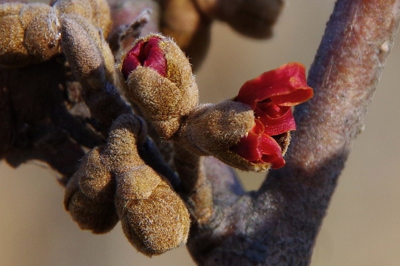 そんな陽気に誘われて、池南側のアカバナマンサクが一部ほころび始めました。お隣のマンサクと並び、毎年公園で一番早く咲くお花なのです。