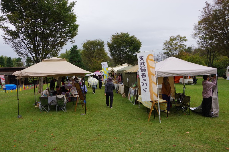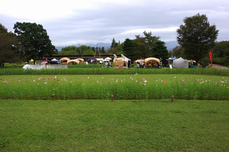 今日は無料入園日。段々原っぱでは『アウトドアパーク&クラフトマルシェ』が開催されました。でも1日を通して小雨の降る、残念なお天気になりました。