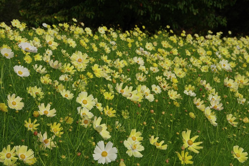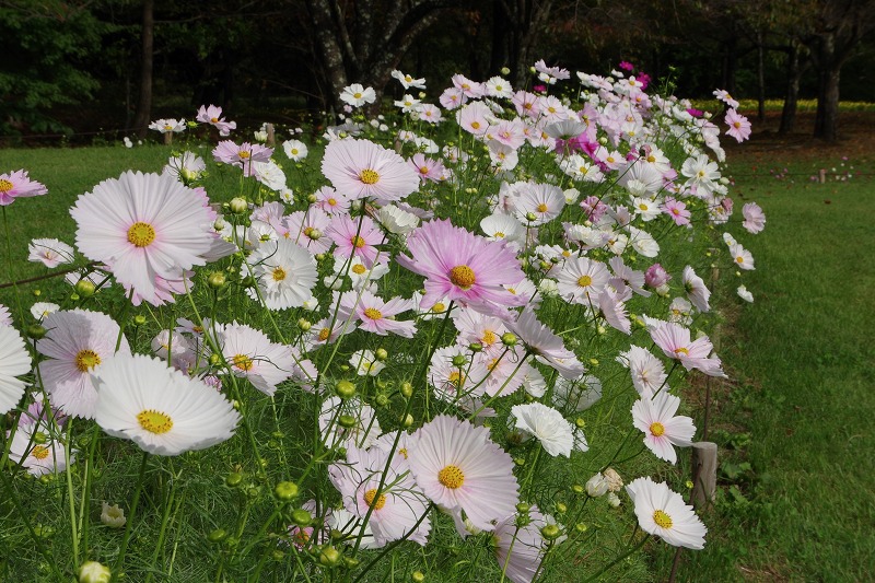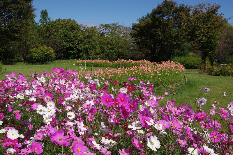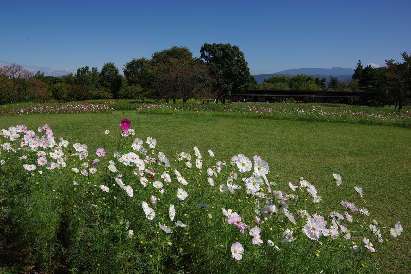 早朝は空一面雲に覆われていましたが、開園時間の頃には青空が広がりました。田園文化ゾーン・段々原っぱのコスモスは、先週末に比べ開花が進んでいます。