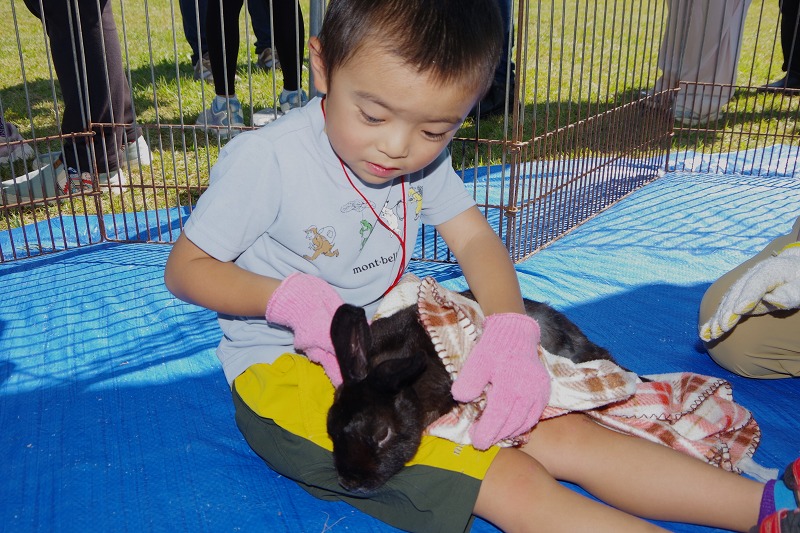 膝の上にウサギさんを乗せているのは、お馴染みの〝おたまくん〟です。今日は楽しみだった『ふれあい動物園』に来てくれましたよ。