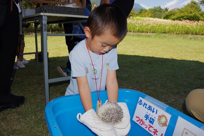 リクガメやハムスター、パンダマウス、ヒヨコなどの小動物を一通り触った後、今度はトゲトゲボールとのふれあい?丸くなっているのはハリネズミです。ずっと丸まったまま、お顔は見せてくれませんでした。恥ずかしかったようですね。