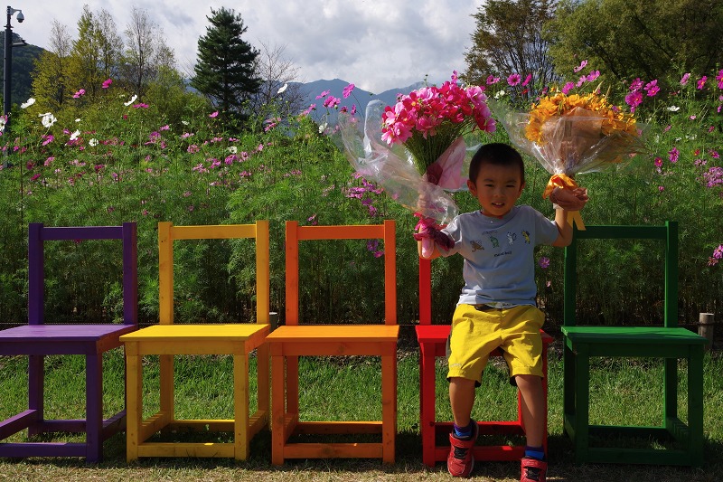 最後はカラフルな椅子に座って記念撮影。コスモスの花束を両手に掲げて力自慢をアピール。ちょっと使い方が違いますが、楽しめればOKなのです。