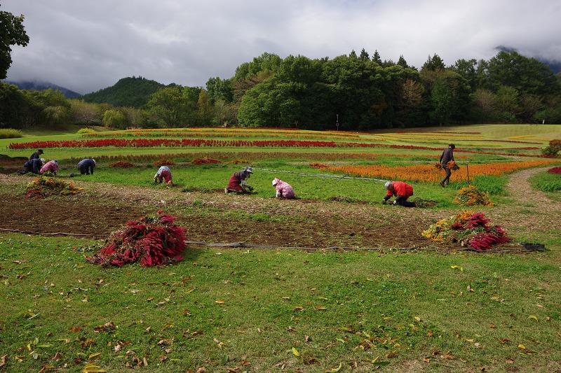 撮影は11時半頃。朝からの作業で、既に手前の花畑が全て抜き取られていました。ケイトウを抜き取るだけなら、あっという間です。