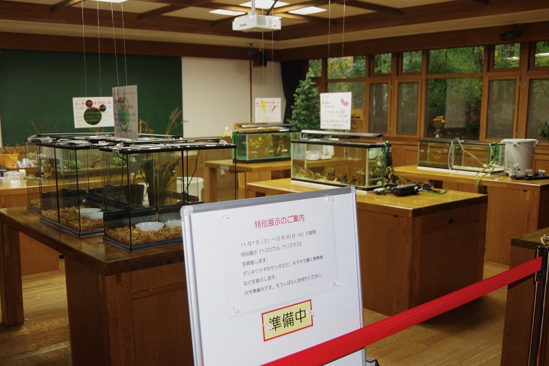 あづみの学校の理科教室では、11月1日より特別展示『トロピカル クリスマス』を開催します。現在、会場の実習室を閉鎖して準備が進められていますよ。