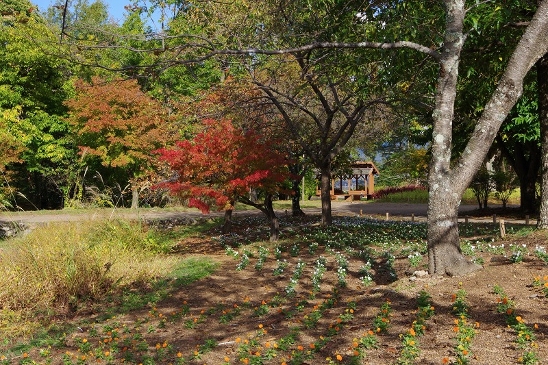 今日は休園日です。昨日1日続いた雨も上がり、晴れ間が広がりました。紅葉が進む公園ではイロハモミジが色付いています。先日植えたばかりのビオラの花壇の中では、小さなイロハモミジが赤く色付いていました。