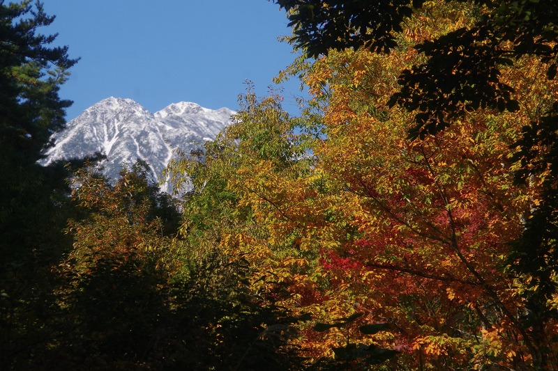 冠雪の蝶ヶ岳と野原の木々の紅葉。少し前までは芝生も緑色をしていましたが、秋が深まると少しずつ色が抜けて茶色くなっていきますよ。