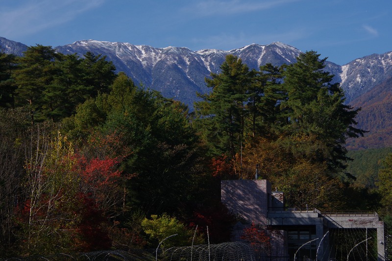 昨日の写真から紅葉と冠雪の様子をご紹介します。まずはお馴染みの池から望む北アルプスの山並み。常念岳から蝶ヶ岳の尾根は白い雪で縁取られていました。