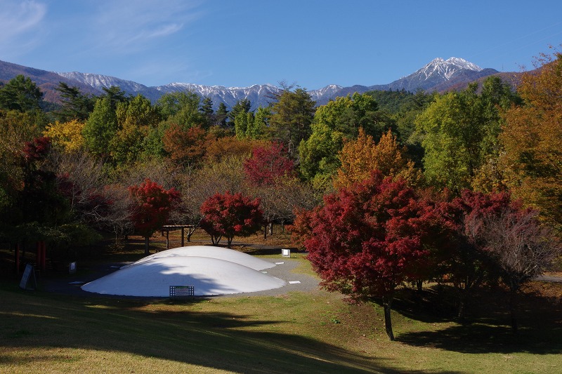 河畔の広場のマシュマロドーム周辺も紅葉が進んでいます。マシュマロドームからは北アルプスは見えませんが、少し離れると絶景が見られるのです。