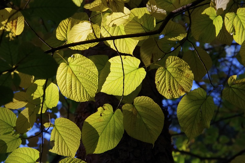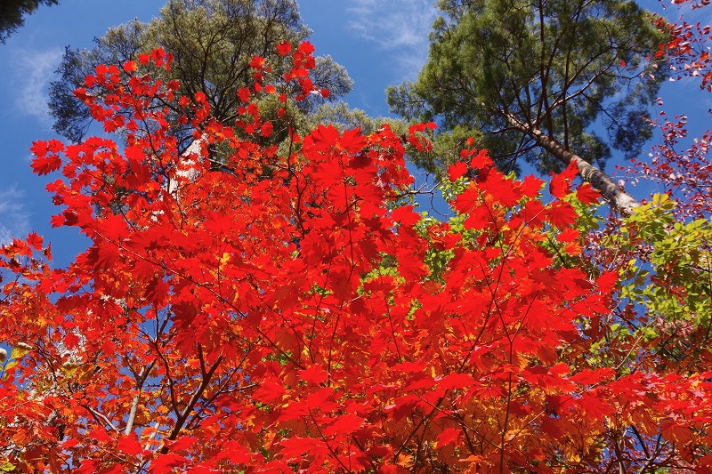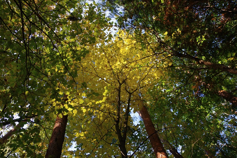 黄色く黄葉しているのはヤマウルシ。羽状複葉の葉が特徴です。下から見ると光が透過して明るく輝いて見えます。赤く紅葉する木も多く見られますよ。