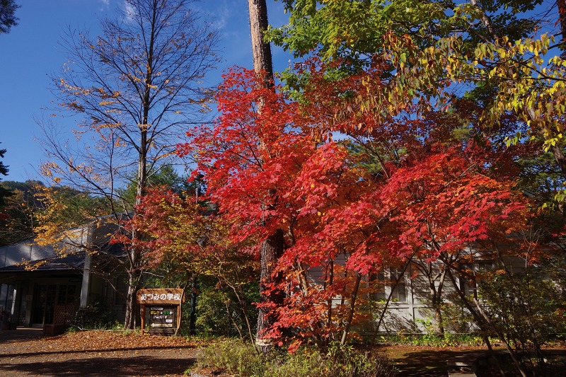 宇宙船の後ろにも写っていた、あづみの学校前のハウチワカエデ。全体が赤く染まりました。下から見上げてもその赤さが際立ちます。