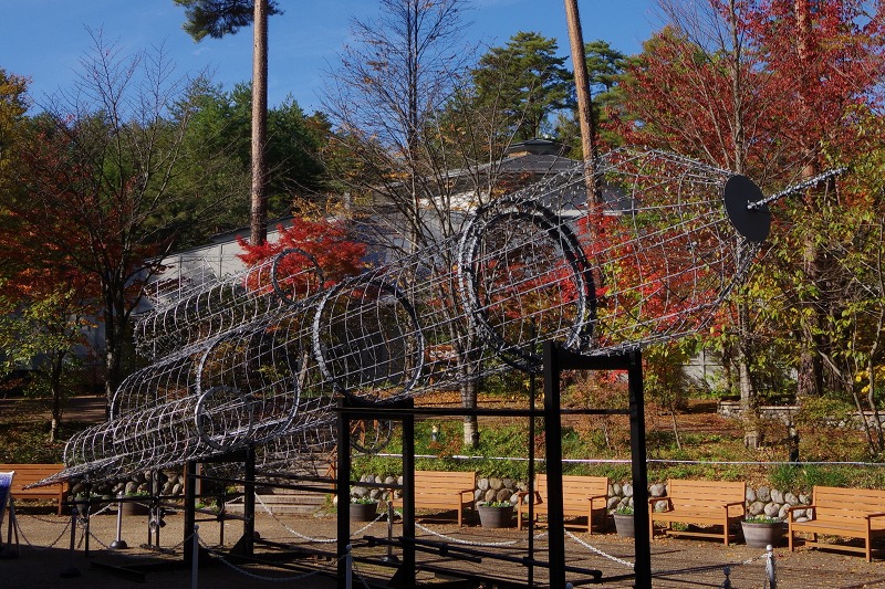 ガイドセンター前広場の「光の宇宙船」。下から見上げると今にも飛び出しそうで迫力満点です。昼間は無機質な骨組みも背景の紅葉に助けられています。