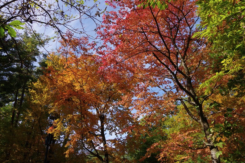 高い場所で黄葉するのはヒトツバカエデ。必然的に見上げるようになります。切れ込みのある他のカエデの葉とは異なる丸い葉が特徴です。