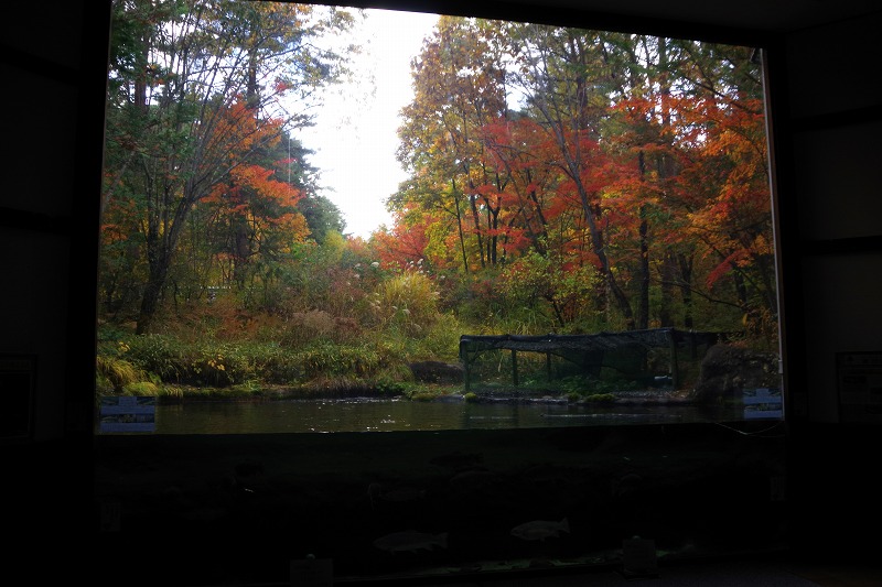 理科教室の屋外水槽から見える紅葉は、大方が落葉しています。ヤマメ水槽の陸場には、カラフルなイロハモミジの絨毯が出来ています。