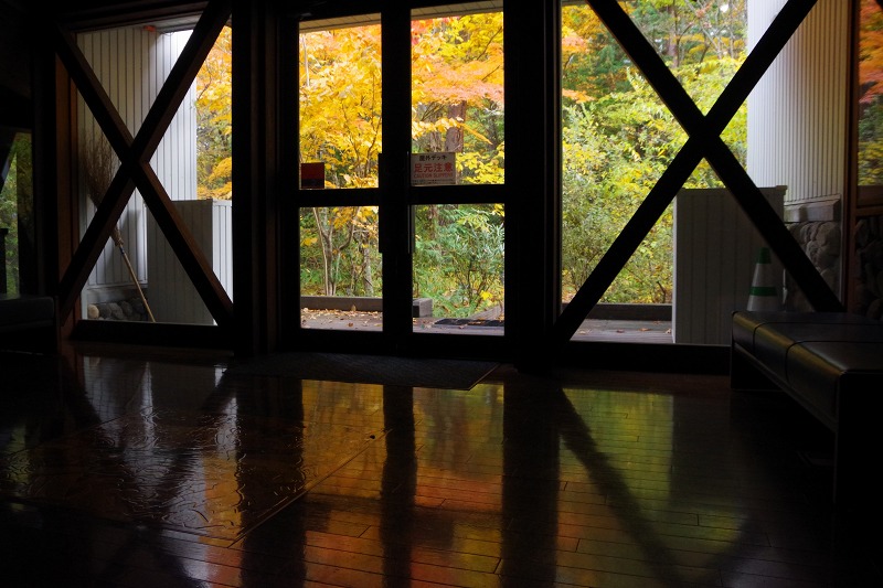 廊下の途中にあるドアの外にはマンサクやダンコウバイ、イロハモミジなどが色付いています。建物の中が暗いので、廊下にも紅葉の色が映っていました。