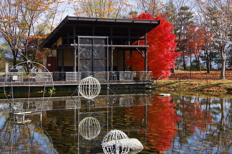 反対側から見ると、水面にも鮮やかな紅葉が映し出されますよ。平日は14:30開園で園内を散策できるのは16:30まで。短い時間になりますが、イルミネーションにも負けない鮮やかな紅葉を楽しんでくださいね。