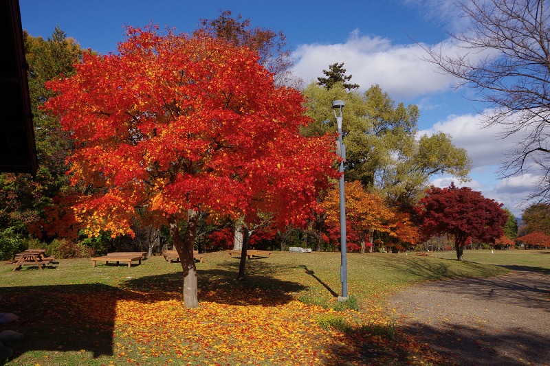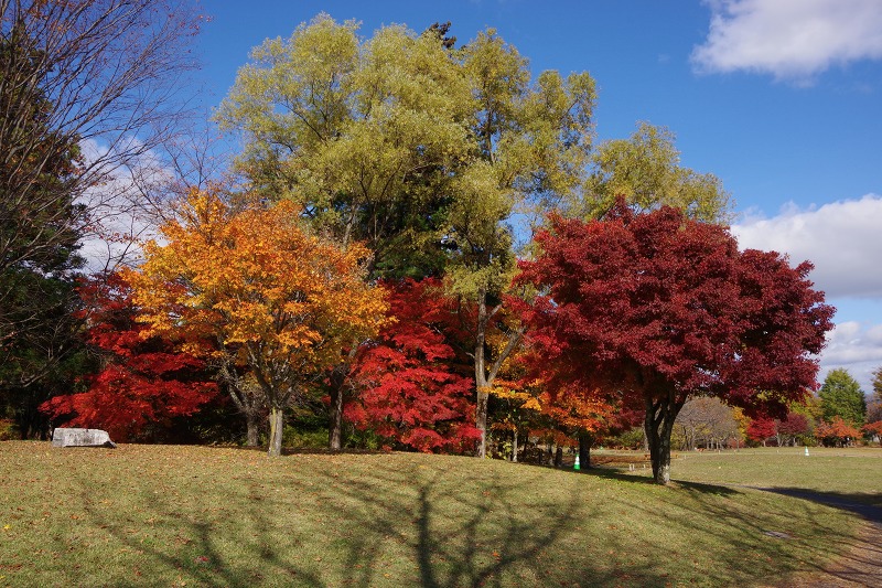 水辺の休憩所と段々原っぱの間にあるモミジの林。黄色やオレンジ、赤や濃赤色などカラフルに色付いています。これだけまとまると、とても綺麗ですね。