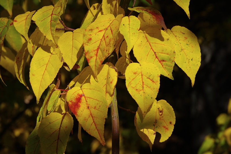 変わってこちらはウリカエデ。細いハート型、またはしずくの形が上下逆さまになったようですね。成長した大きな木は、このような葉の形になるようです。