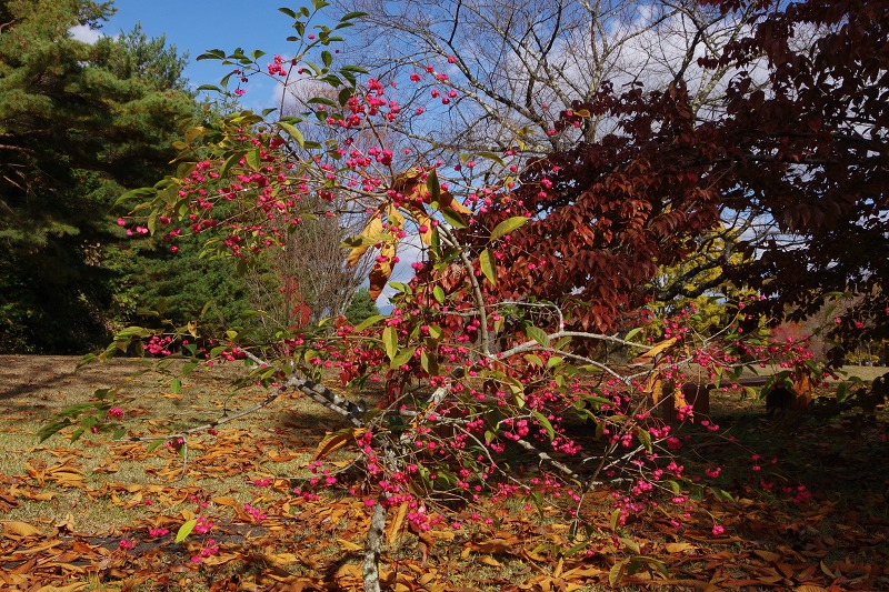 野原の一画にあるのは小さなマユミの木。剪定しているわけではありませんが、ずっとこの大きさです。この時期は枝いっぱいにピンク色の実をぶら下げます。