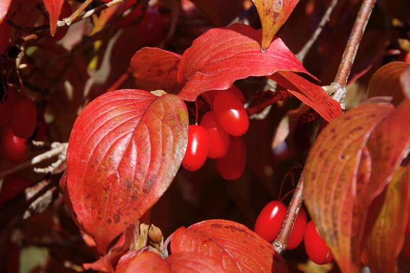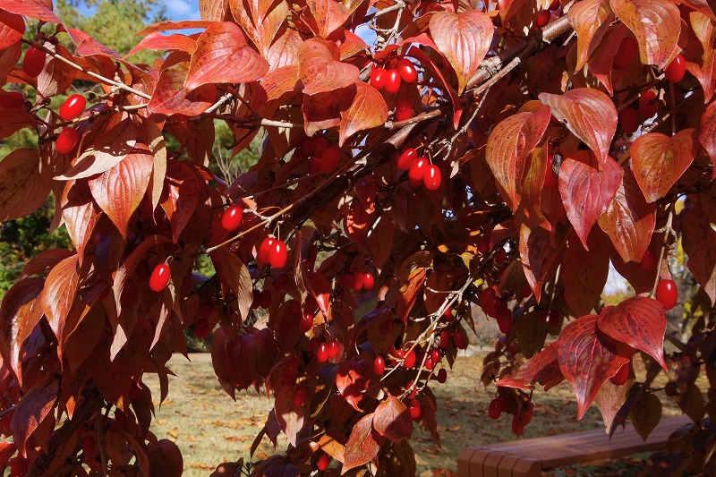 マユミのすぐ横にはサンシュユの木があります。紅葉する葉も綺麗ですが、その枝には赤いが付いています。グミのような楕円形の実が特徴です。