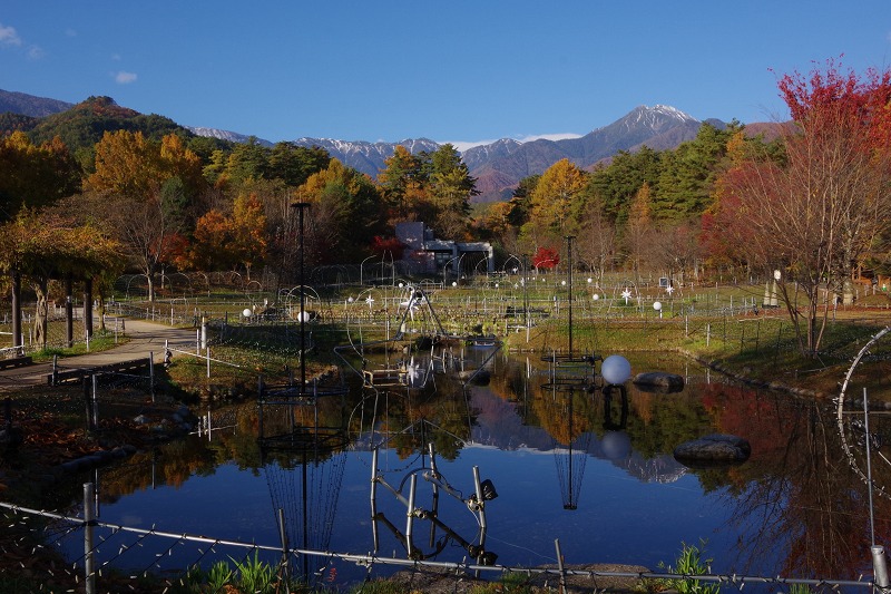 今朝の写真。北アルプスの尾根に残る雪と木々の紅葉が、池の水鏡に綺麗に映し出されていました。イルミネーションが無ければ絵葉書になるのですが・・・