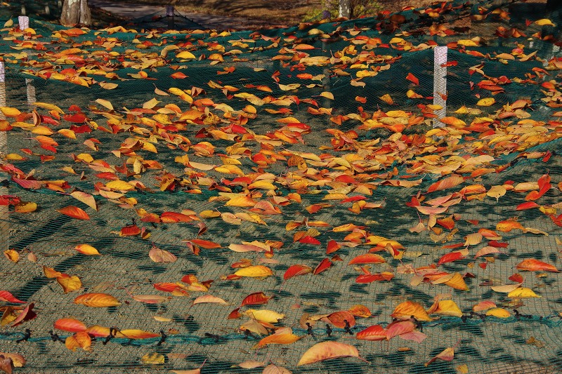段々原っぱの八重桜、カンザン(関山)の紅葉。チューリップ畑にかけられたサル除けネットの上にも、綺麗な落ち葉が乗っていました。