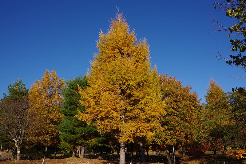 カラマツの黄葉も見頃を迎えています。日本に自生する針葉樹の中で唯一落葉します。漢字でも「唐松」の他に「落葉松」とも書かれますよ。