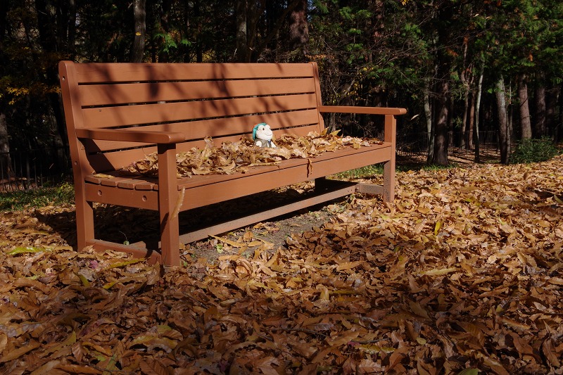 その後公園を散策していると、段々花畑の前で落ち葉のベンチを発見。ベンチの隣には大きなクリの木があり、大量の落ち葉を周囲に落としていたのです。