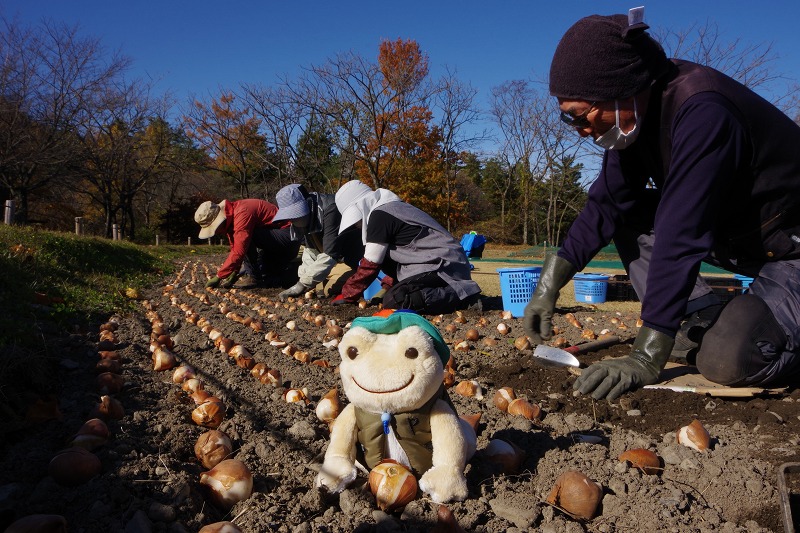 今日は休園日です。段々原っぱでは、チューリップの球根植え付け作業が続けられています。久しぶりの登場は〝かえるのピクルス〟です。〝シルバーズ〟の皆さんに混じって球根の植え付け作業。しっかりお手伝いしてくださいね。