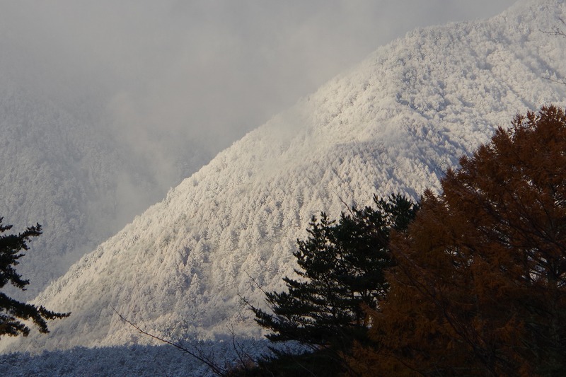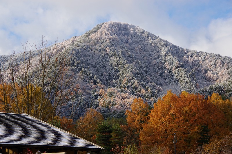 しばらすると山の方も雲がとれて日が当たり始めました。お馴染みの〝おにぎり山〟も雪化粧。薄く積もっているので、雪の下の紅葉も良くわかります。