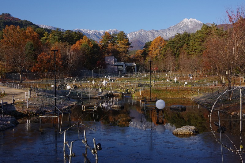 今朝の公園は氷点下3℃台まで気温が下がりました。昨日は雲で見えなかった常念岳も綺麗に見えています。水辺の休憩所前の池には薄氷が張っていましたよ。