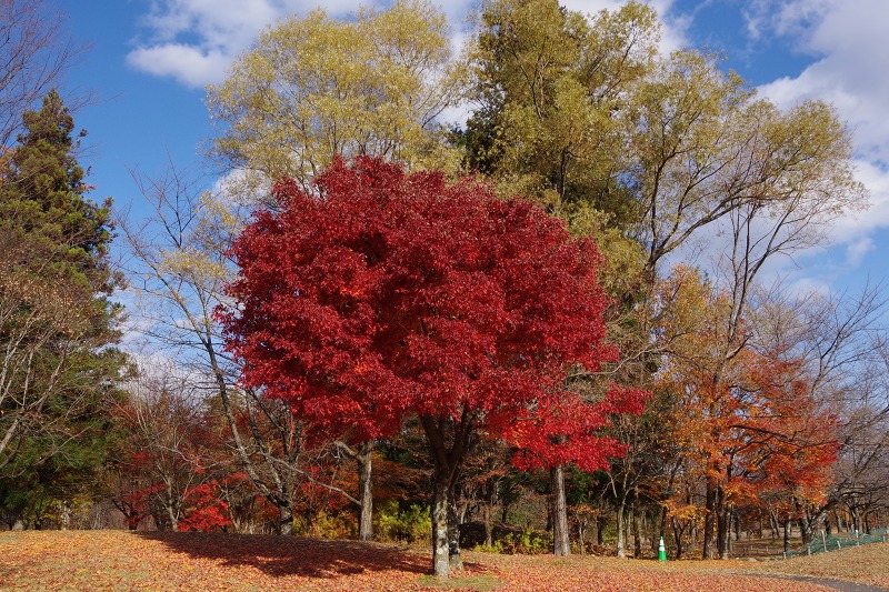 公園の紅葉も終盤を迎えています。色鮮やかなモミジは残り僅かです。数日前の雪や霜の影響で、あっという間に葉を落としたようです。