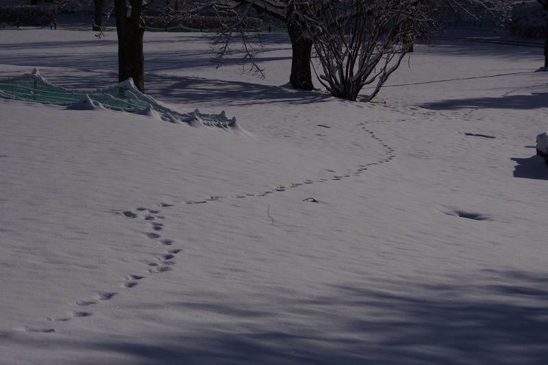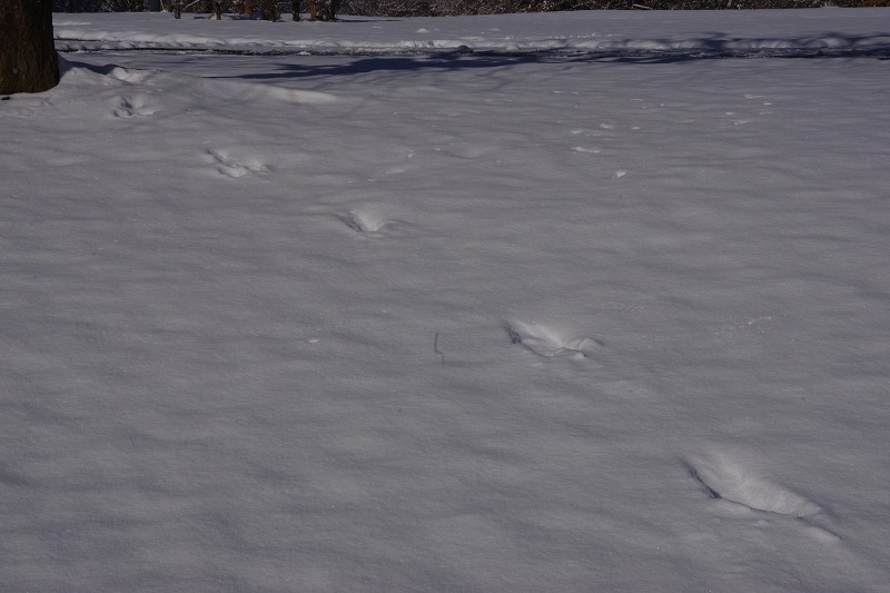 野原の端にあった足跡。雪があってわかりにくいですが、ここは細園路になっています。園路に沿って歩いていますよ。雪の日のお散歩かもしれません。