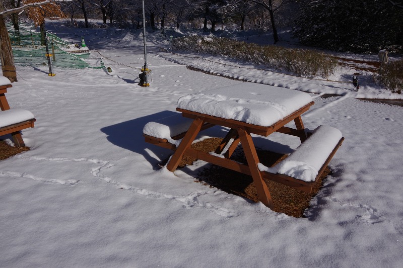 池の横に置かれたテーブル。足跡は地面からテーブルの上にジャンプしていました。雪が積もると様々な動物の足跡が見られます。皆さんも探してくださいね。