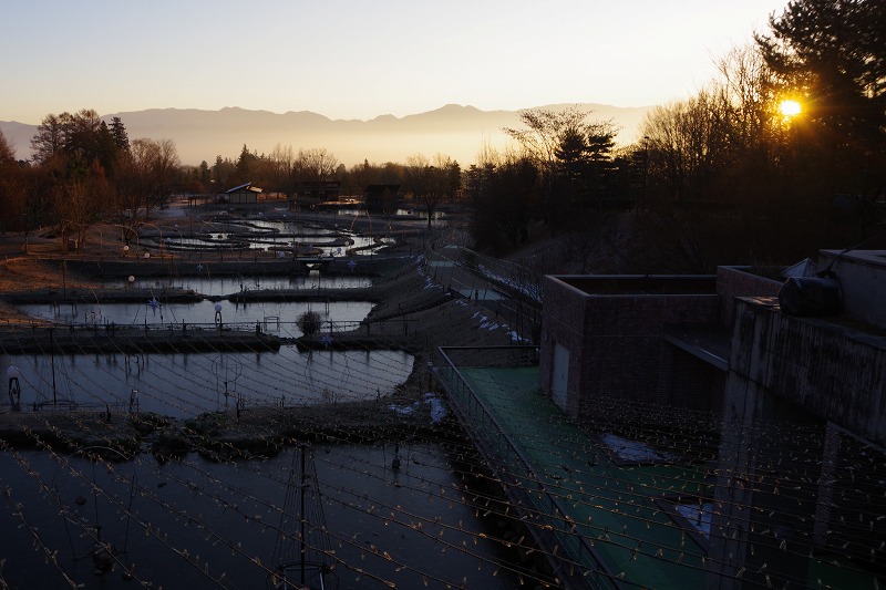 急いで展望テラスの2階に移動して東の方角を撮影。冬の季節の太陽は真東よりも少し南側に出るようです。木々の間から太陽を見ることが出来ました。