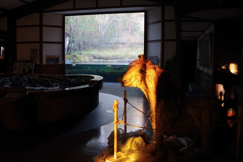 こちらはあづみの学校の玄関ホール。藁細工の馬の顔にちょうど朝日があたります。これもごく短い時間だけ。少し時間が経つと日は当たらなくなります。早起きして見ることの出来る、ほんの一瞬の表情ですね。