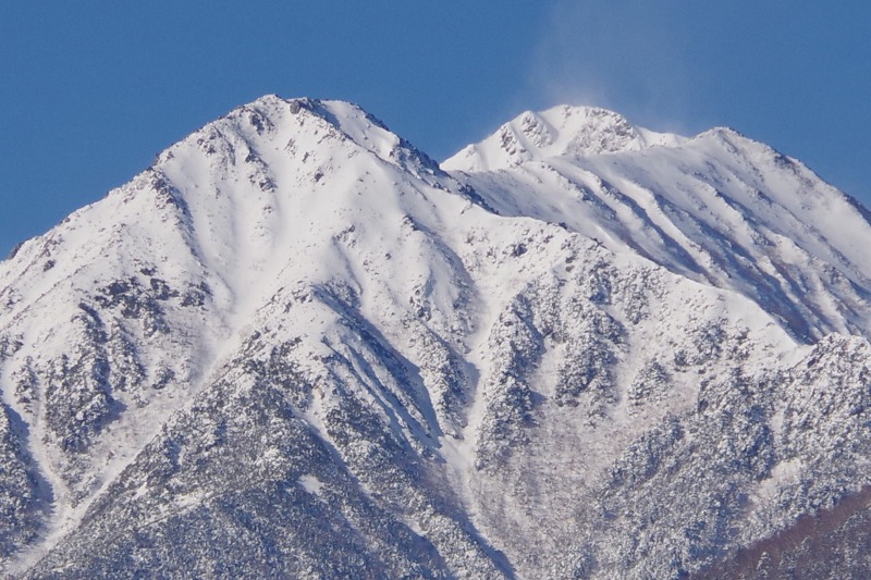 常念岳の山頂付近を見てみると、写真の中央辺りが盛り上がっています。春になると雪形「常念坊」として黒く現れる部分です。なんとなく形がわかりますね。